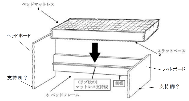 審判では、甲1発明の「ヘッドボード」と「フットボード」(いずれも板状のもの)の下端部が、上図のように「支持脚」であると認定しました。